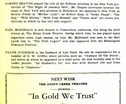 | Also playing “Guts” Regan during the summer of 1936 was the actor who had spent more time with the playwright than any other actor. As the program for this Stony Creek, Conn., production makes clear, Frank O’Connor was the husband of playwright Ayn Rand. The biographical sketch was otherwise fanciful, as O’Connor had not been in movies as a child, and his appearance in Orphans of the Storm was too inconsequential for him to be remembered for it. images: career sketch of Frank O’Connor in the program of the play in Stony Creek, Connecticut; Robert Shayne is to be discussed here next