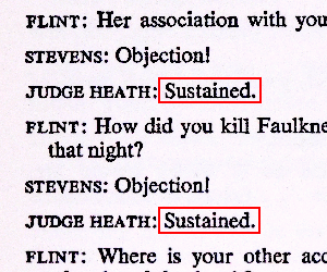 | J. Arthur Young had little to say in the original Broadway production of “Night of January 16.” As the judge, he had about three dozen lines, all short, many just a single word. Nonetheless, those months of performances exposed him so thoroughly to the larger roles that he was a wise choice for producers in other cities in casting an attorney. image: a dialogue exchange in “Night of January 16th” with highlighting of some of the judge’s short lines; reproduced from a much-later mass-market paperback edition of the play |