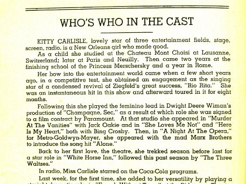 | Kitty Carlisle had starred in musical films, in Broadway shows, and on radio. She’s remembered for being the leading lady opposite the Marx Brothers in their 1935 classic A Night at the Opera. images: (right) Kitty Carlisle; Kitty Carlisle with Walter Woolf King in A Night at the Opera; poster for A Night at the Opera with art work by Al Hirschfeld and a picture of Carlisle bottom right |