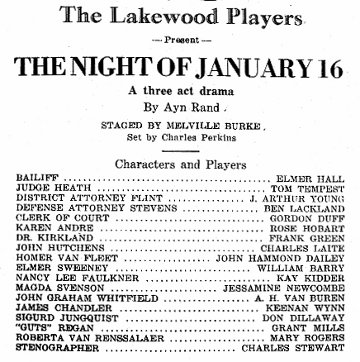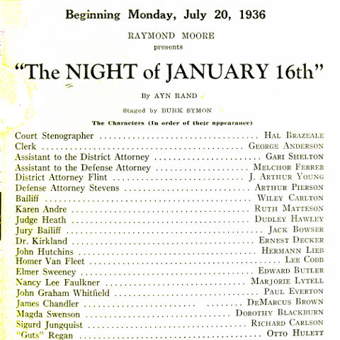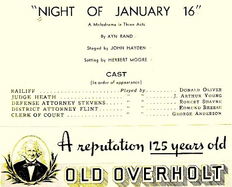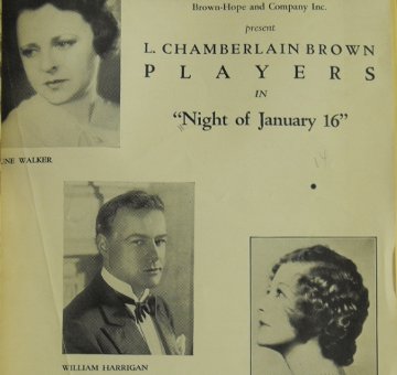 Playbill of the original Broadway production. Among the actors listed are Robert Shayne and J. Arthur Young.] image: the first program of “Night of January 16” on Broadway and the first under that or similar title |