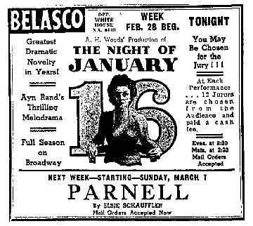 Productions of “Night of January 16th” have been ongoing since the Broadway premiere—regionally, locally, at high schools and colleges—providing early opportunities for actors who would go on to national attention. image: Washington Post, February 28, 1937, pg. T2 |