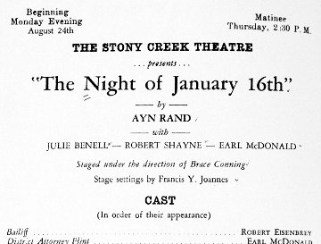 | You may have noticed an actor already discussed—Robert Shayne—atop the cast. Shayne took his experience in the Broadway production, and parlayed it into hires in many more cities, large and small. The next actor discussed here did likewise. image: the cover of the Stony Creek program Note: Shayne also played Defense Attorney Stevens in Cohasset, Massachusetts, summer 1937, and in Great Neck, Long Island, summer 1938. Though Robert Shayne played a lawyer in productions of Night of January 16th starting with the 1935 Broadway production, he would have transitioned to the major gangster role had Ayn Rand prevailed in a suggestion to the company behind the Broadway production that, rather than William Bakewell being hired as Walter Pidgeons replacement days prior to Pidgeons last performance, the role go to one of two two suggested alternatives she offered: ... Mr. Robert Shayne, who knows the part. (letter by Ayn Rand dated October 14, 1935, in Letters of Ayn Rand, page 23) |